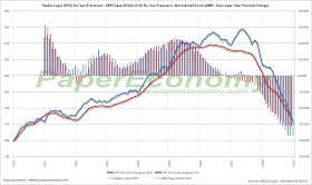 As I had noted in a prior post, given their strong correlation, the home price indices provided daily by Radar Logic can be effectively used as a preview of the more popular monthly S&P/Case-Shiller home price indices.The current Radar Logic data reported on residential real estate transactions (condos, multi and single family homes) that settled as late as January 26 appears to indicate that price declines are continuing in every market while accelerating notably in some.
